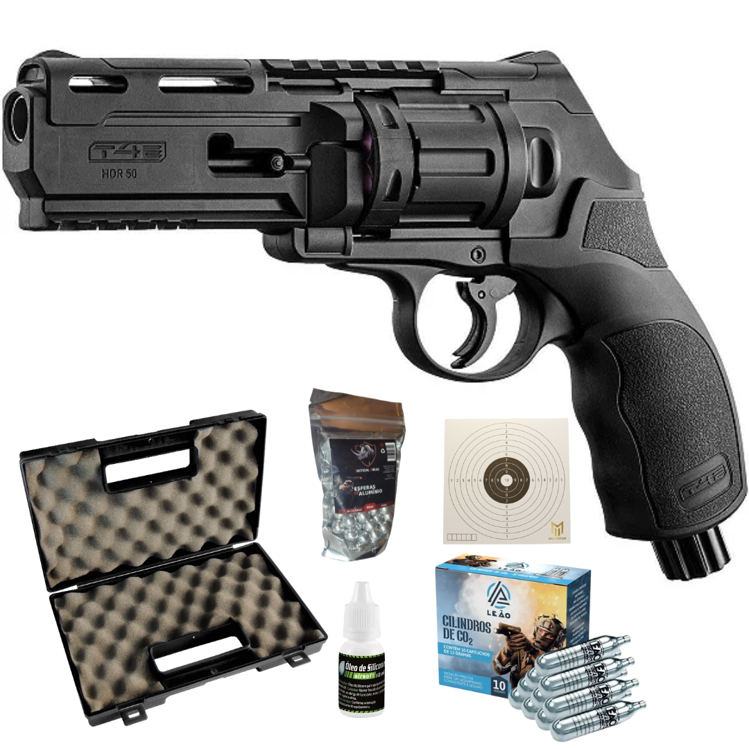 O Kit T4E TR.50 da Umarex é uma solução completa para treino tático, paintball recreativo e aplicações de home defense. Com funcionamento por CO₂ e design robusto, este revólver de pressão calibre .50 dispara projéteis não letais com alto impacto e precisão. Acompanha esferas de alumínio 12,40 mm, case rígido para transporte seguro, 10 cilindros de CO2 e alvos de papel para prática.