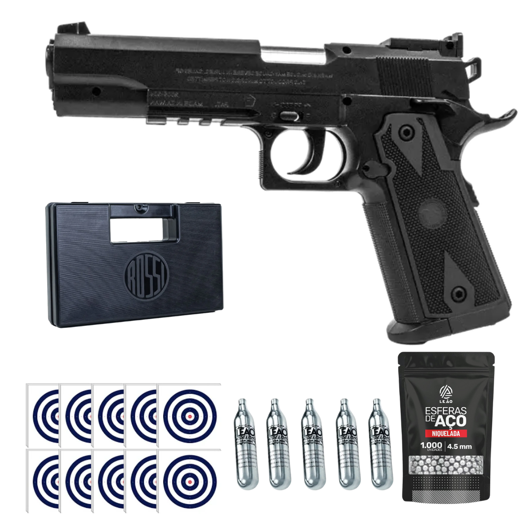 Pistola de Pressão 1911 Rossi CO2 4,5mm + 5 Cilindros CO2 + Case + 1000 Esferas – Kit Completo Tiro Esportivo